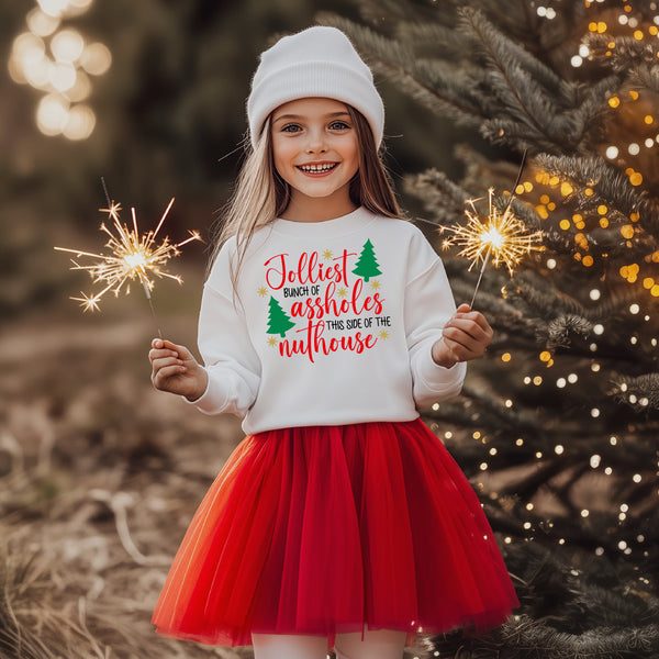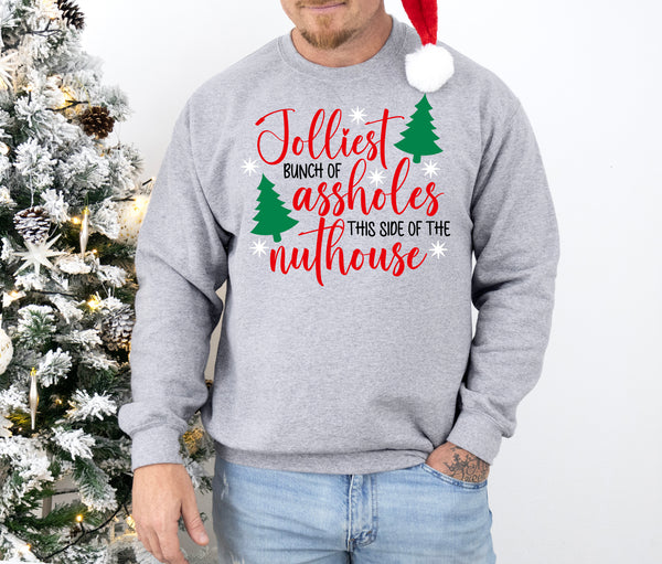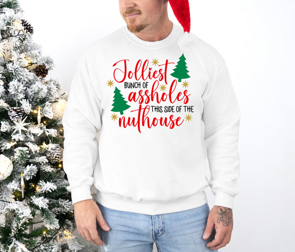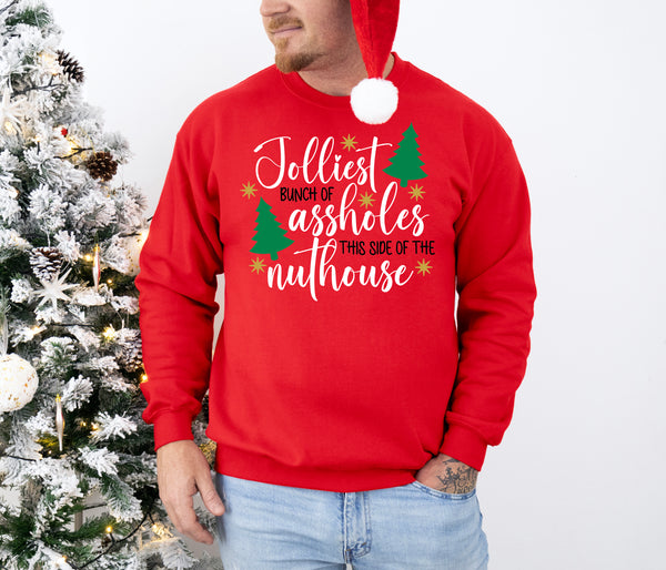 Get into the Holiday Spirit with our Jolliest Bunch of Assholes on this side of the Nuthouse, Funny Christmas Vacation themed Sweatshirt! They are soft, comfy and can make the perfect gift for the holidays...... OR just put this sweatshirt on, lounge around in the house, drink your favorite cup of hot chocolate and binge watch your favorite Christmas movie :)